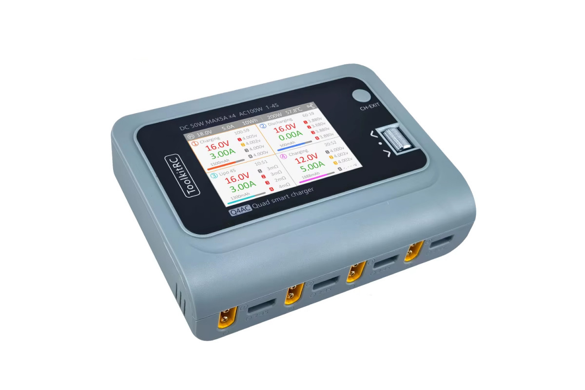 Характеристики: * Вхідна напруга: AC 100-240V, максимум 200W 1.5A; DC 10.0-18.0V @ Max 20A * Тип батареї: Lipo LiHV LiFe Lion @ 1-4S; NiMh @ 1-10S; Pb @ 1-8S * Струм балансування: 240mA @ 2-4S * Потужність заряджання: 50W @ MAX 5A * 4 * Потужність розряджання: 5W @ MAX 2A * 4 * Розмір продукту: 150мм * 112мм * 36.5мм * Вага продукту: 450г * Розмір упаковки: 160 * 160 * 46 мм * Вага упаковки: 600г